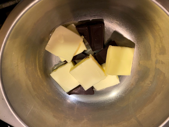 Melt the chocolate and the butter in top of a double boiler. Stir and remove from the heat.